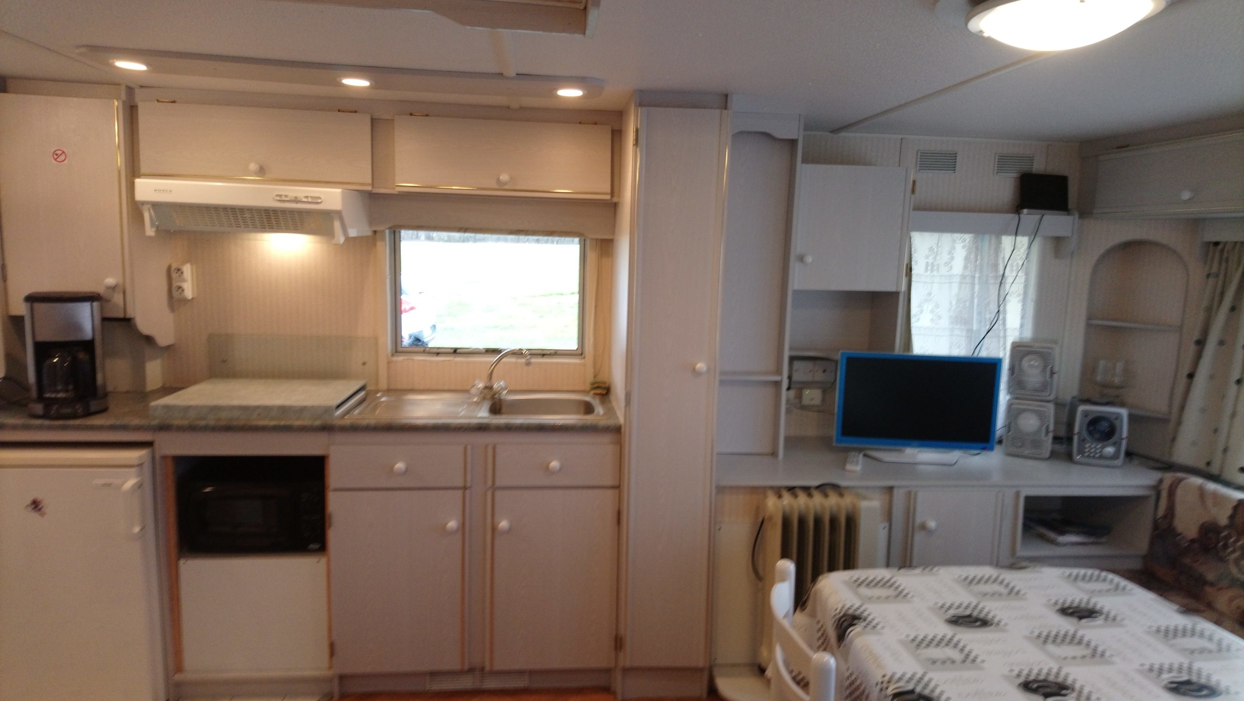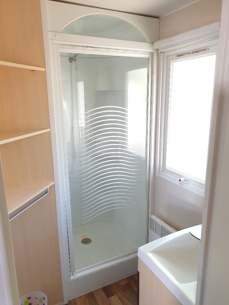 Bloc sanitaire commun avec douche, wc, lavabo (eau chaude) et évier (eau chaude).